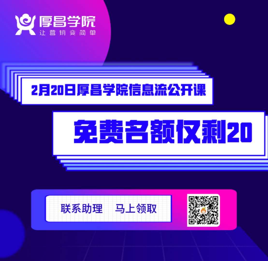 2.20晚8点,厚昌学院信息流公开课将会为大家详细讲解:短视频创意制作方法及趋势,公开课仅剩最后30个免费名额,快来扫码联系助理领取吧