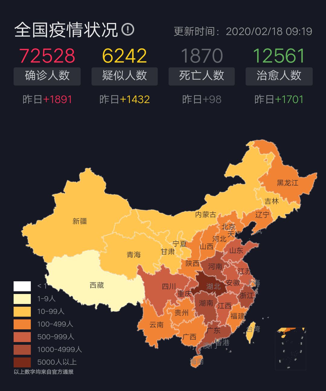 全国新增确诊病例1886例,累计报告确诊72436例,累计治愈12552例,累计死亡1868例
