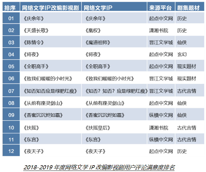 今日,《2019-2020年度网络文学IP影视剧改编潜力评估报告》在京发布。报告共发布两个榜单,榜单一:2018-2019年度网络文学IP改编影视剧用户评论满意度排名,上榜IP共12个,前三名为:《庆余年》《天盛长歌》《陈情令》。榜单二:2019-2020年度网络文学IP影视剧改编潜力预测。共46个IP入榜,主要来自起点中文网、潇湘书院、晋江文学城、纵横中文网等。