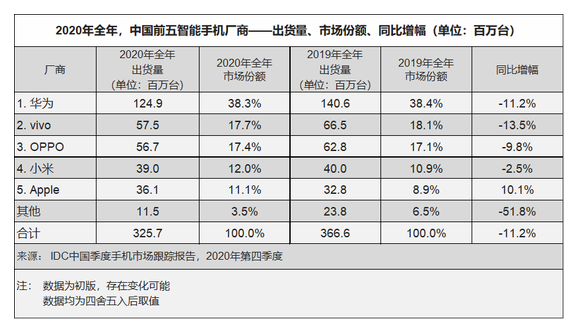 8、IDC:2020年国内手机市场华为出货量夺冠,5G手机出货量占比过半