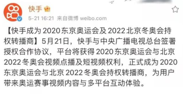 1、快手成为2020东京奥运会与北京2022年冬奥会持权转播商