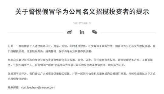 5月21日,华为在其官网发布提示称,近期,一些机构和个人通过网络平台、电话、短信、即时通信软件、社交媒体工具等方式,假冒华为公司名义招揽投资者。华为及关联公司从未向社会公众投资者提供任何有关股票、基金、证券、信托或期货等投资、融资或理财等产品、工具或服务。任何机构或个人,假冒“华为”“哈勃”或其他华为关联公司招揽投资者及类似活动,均与华为无关。