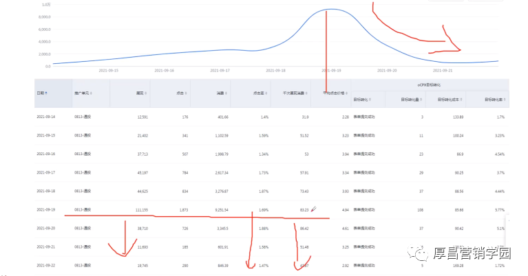 各位注意啊,当你的单元发现连续的创意的点击率下降,而且你发现你的转化量已经很少了,类似于下图。