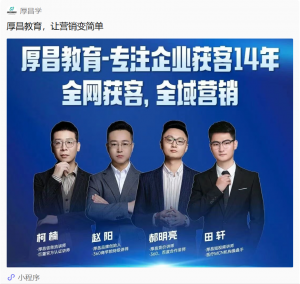厚昌教育创建于2012年,是国内最早一批致力于网络营销培训的机构。多年时间累积培训学员上万人,为众多企业提供专业技术人员。近年来深入中小型企业网络营销策略研究,已为上千家企业提供营销解决方案。现开设竞价推广、信息流优化、企业短视频、营销管理课、全网获客线下大课,以及企业定制培训与营销顾问服务。在垂直行业的渗透率与知名度极高。